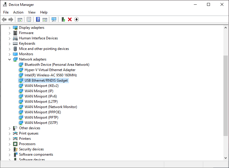 Open Device Manager on your computer and verify that “USB Ethernet/RNDIS Gadget” is listed under the “Network adapters” section.